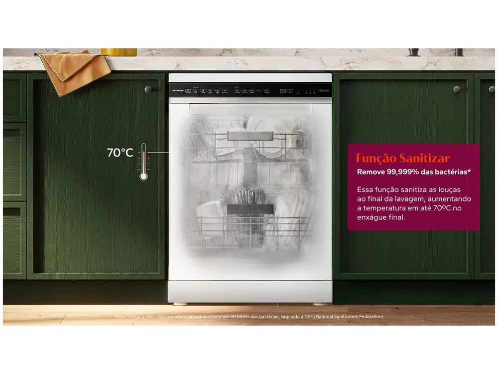 The built-in dishwasher and Brastemp BLF61AB floor in white color with 15 services, guarantees excellence in washing performance. It offers various functions such as the Smart Sensor Function, an intelligent function that detects the level of dirt in dishes, accurately calculating the time and amount of water to ensure more efficient cleaning. It combines sustainability and practicality with a technology that saves up to 14% water and up to 23% energy per service. The Sanitize function removes 99.999% of bacteria. This function sanitizes dishes at the end of washing, increasing the temperature by up to 70 °C at the final rinse. Ideal for cleaning and sanitizing more sensitive items such as baby products, even crockery, bottles and others. Now with a capacity of 15 services and 8% more internal space than the previous model, but without changing its size on the outside. Wash your dishes without taking your time: Smart technologies that free you from the worry and chore with the dishes to spend more time with the family, doing everything you love most at home. The Acquaspray Function releases jets of water that make a pre-wash, removing dirt. Accumulate the dishes in the machine throughout the day, being able to wash them all at once, without worrying about odors or the mess caused by the dishes.