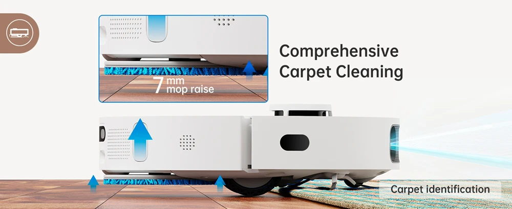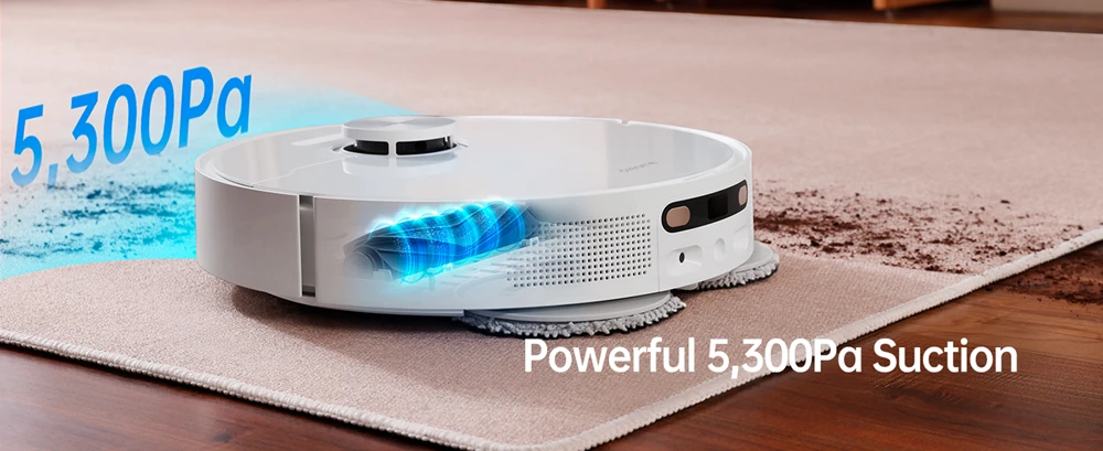 【C】: Robust Vacuuming and Carpet Cleaning: Powerful 5,300Pa suction, automatic carpet detection, suction boost, and a robust rubber brush coordinate to pull household debris, hair, and dust from floors and carpets. Set cleaning behavior to have carpet identification avoid carpets while mopping or simply raise the mop pads while vacuuming