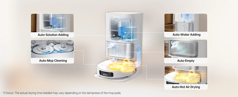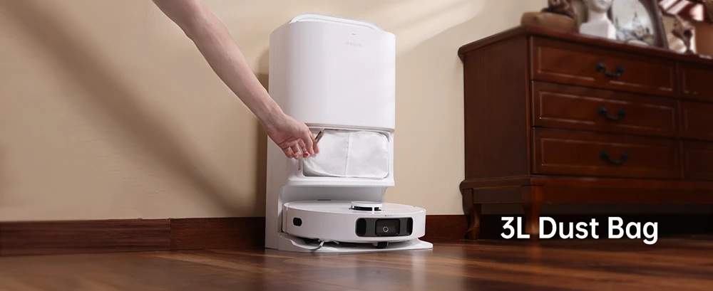 【A】:Fully Automated Cleaning: Automatic dust collection, mop-cleaning and -drying, water-refilling, solution-adding, fast mapping, and path-planning all combine to make fully automated home cleaning a reality. The convenient auto-empty system utilizes our exclusive DualBoost 2.0 system to blow air into the robot’s dust box and vacuum it into a 3L dust bag, giving you up to 60 days of automatic, hands-off cleaning