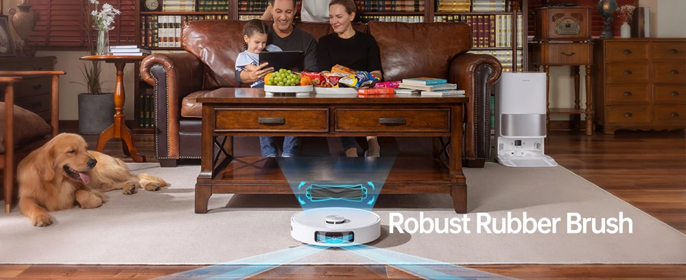 5300 Pa suction, automatic carpet detection, suction boost, and a robust rubber brush coordinate to pull household debris up from rugs, out of carpets, and off of hard floors.