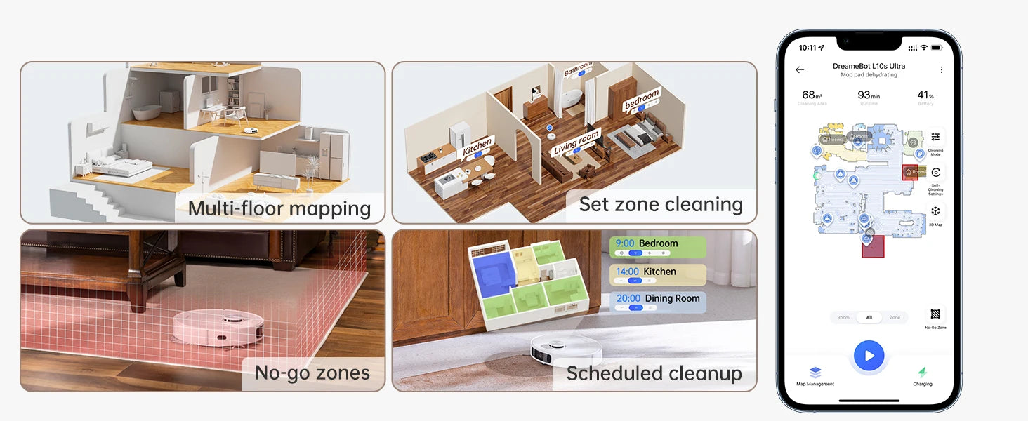 【F】:Customize Your Cleaning from Anywhere: Create multiple maps for multi-floor houses, segment rooms, create virtual walls, set no-go zones, and create cleaning schedules and routines. Start, pause, or stop cleaning with voice commands or supervise your home using the video control in the app. The power is at the tip of your tongue and the ends of your fingers