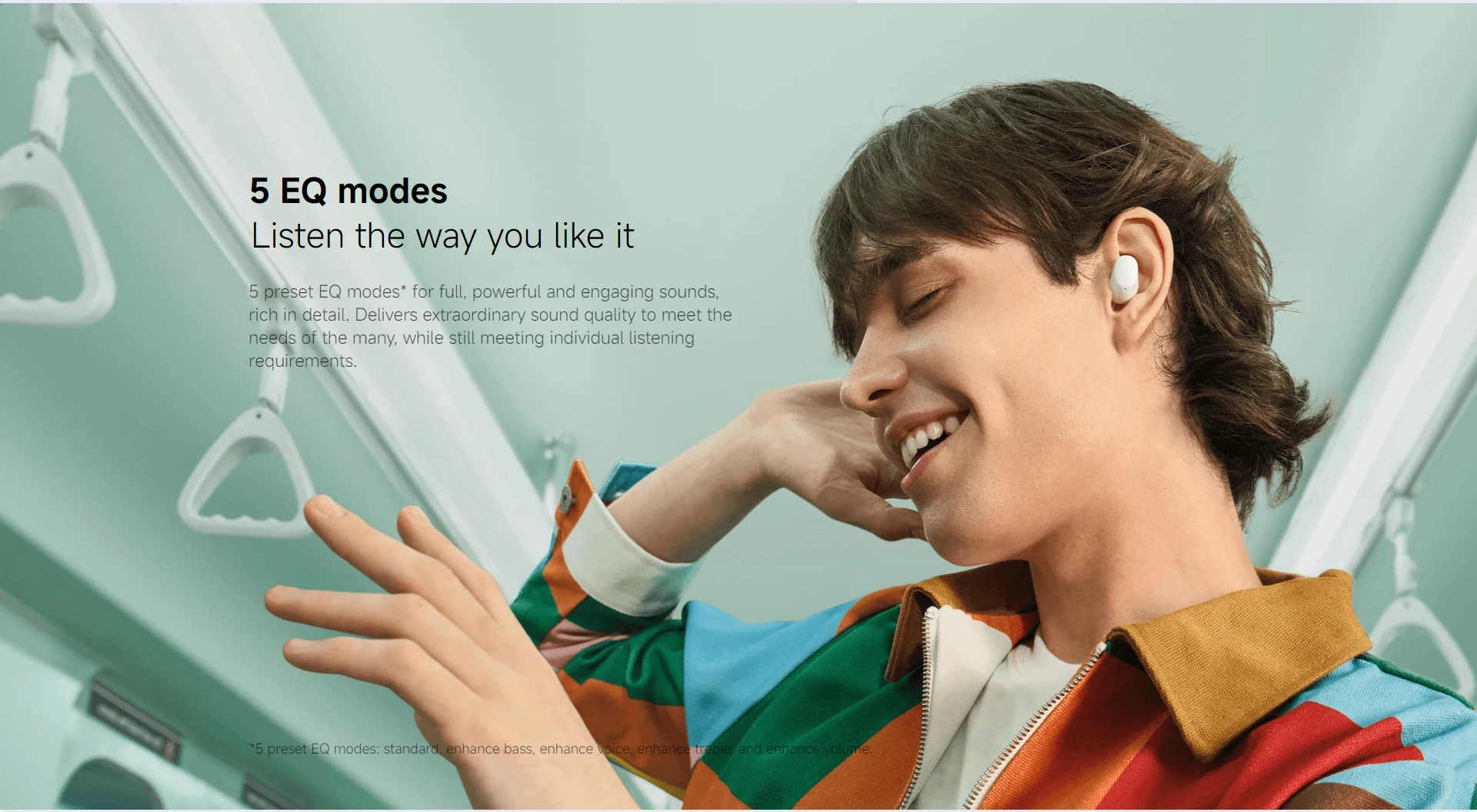 5 preset EQ modes* for full, powerful and engaging sounds, rich in detail. Delivers extraordinary sound quality to meet the needs of the many, while still meeting individual listening requirements.