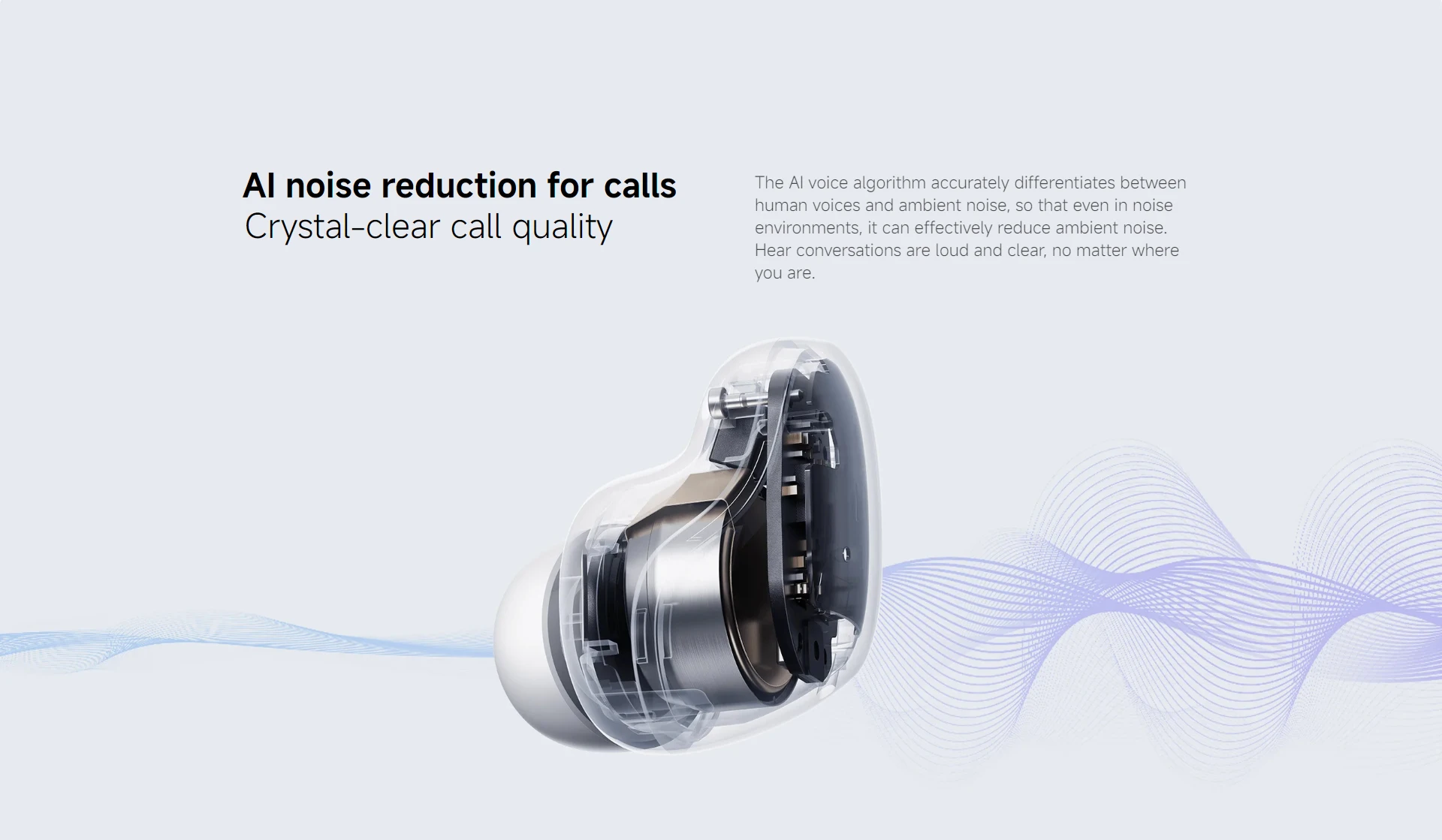 The AI voice algorithm accurately differentiates between human voices and ambient noise, so that even in noise environments, it can effectively reduce ambient noise. Hear conversations are loud and clear, no matter where you are.