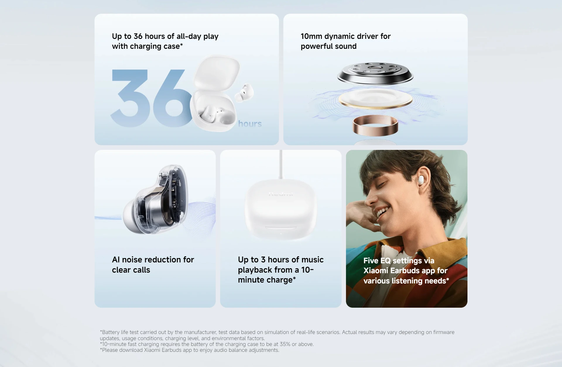 Download the Xiaomi Earbuds app to adjust EQ settings and touch control settings for your Redmi Buds 6 Play. You’re in control — adjust settings for optimal auditory experiences.
