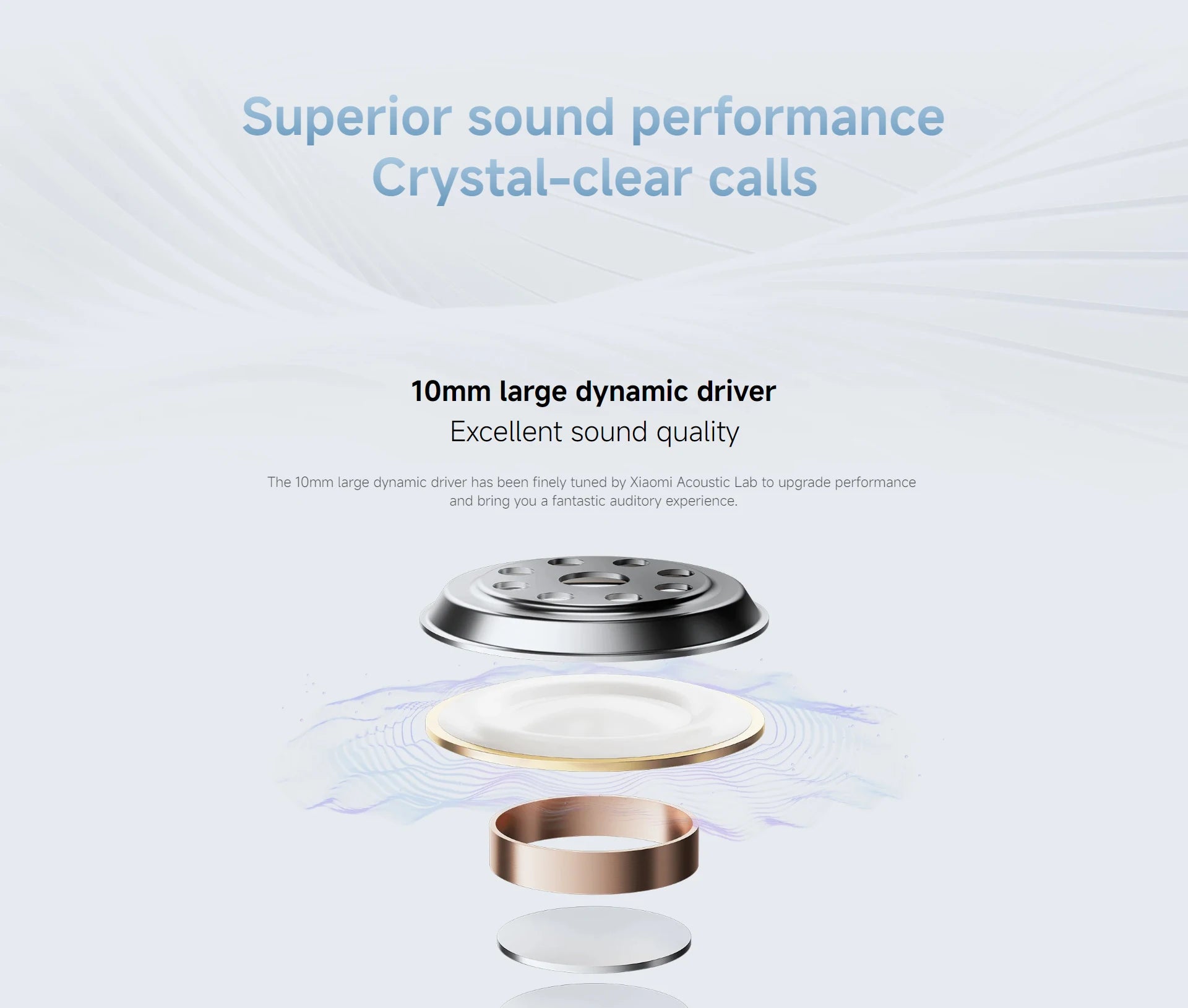 The 10mm large dynamic driver has been finely tuned by Xiaomi Acoustic Lab to upgrade performance and bring you a fantastic auditory experience.